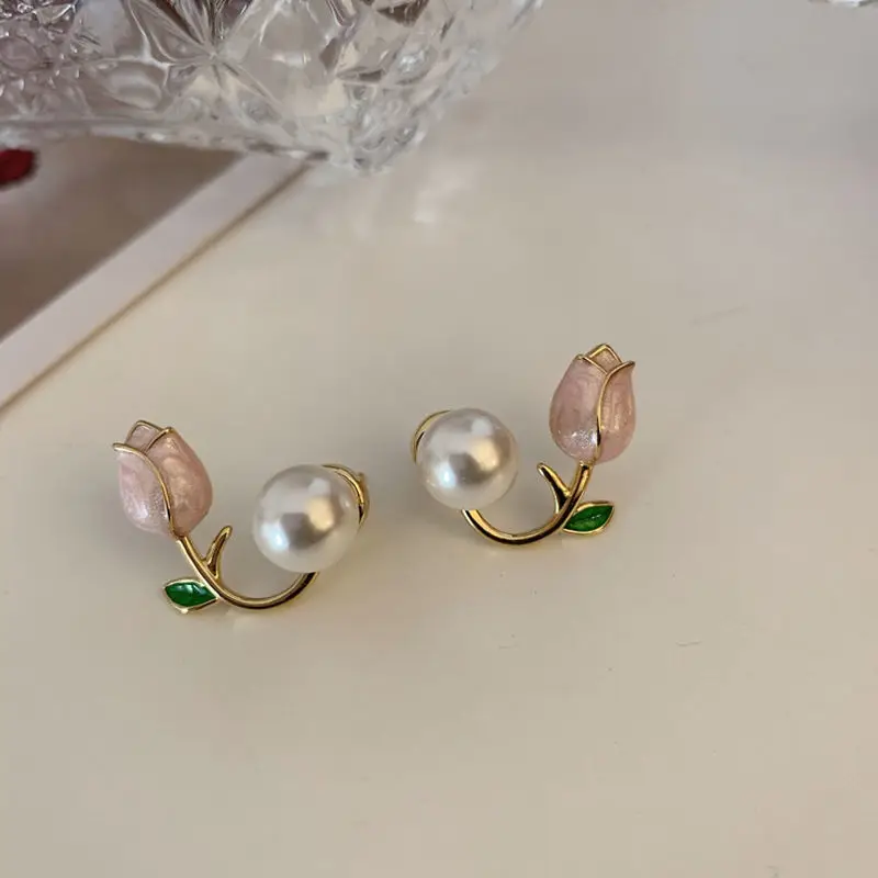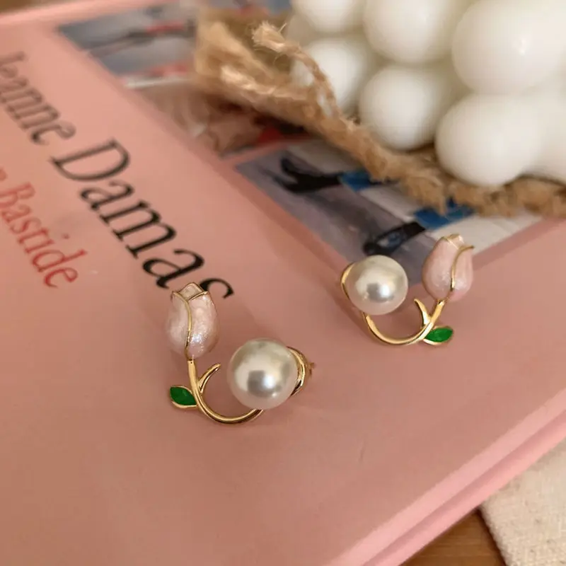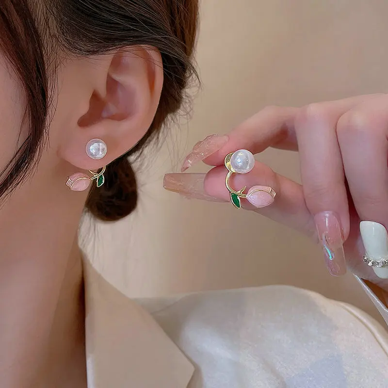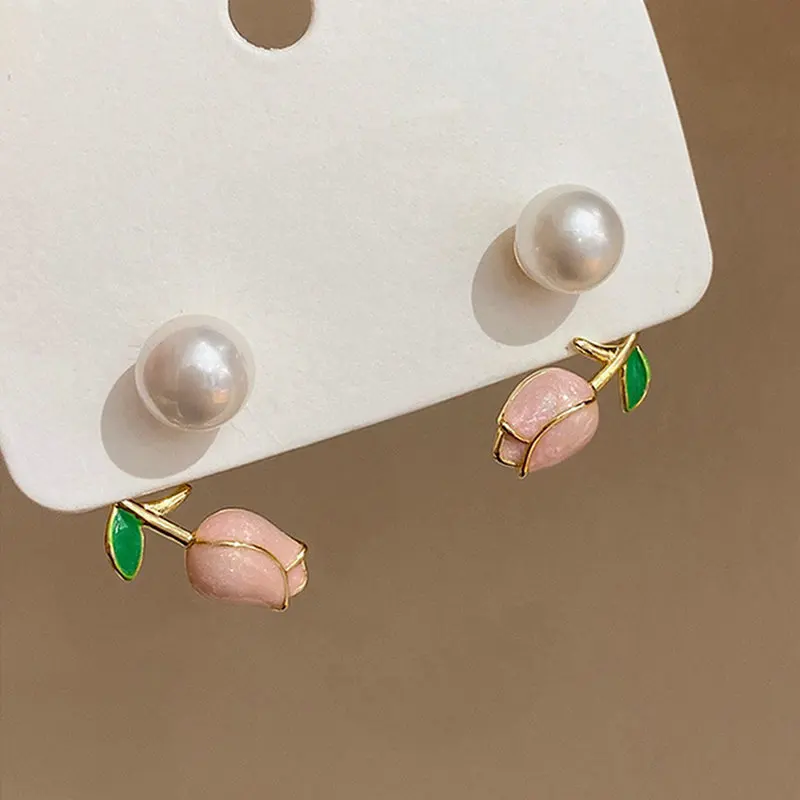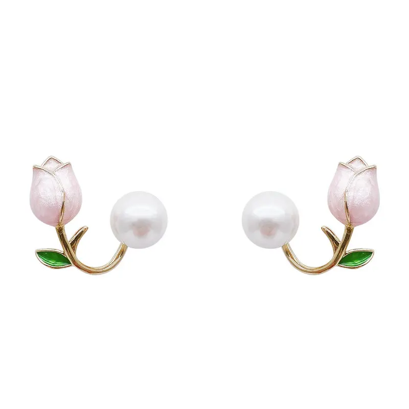Diseño de aretes de tulipán rosa, aretes de perlas delanteros